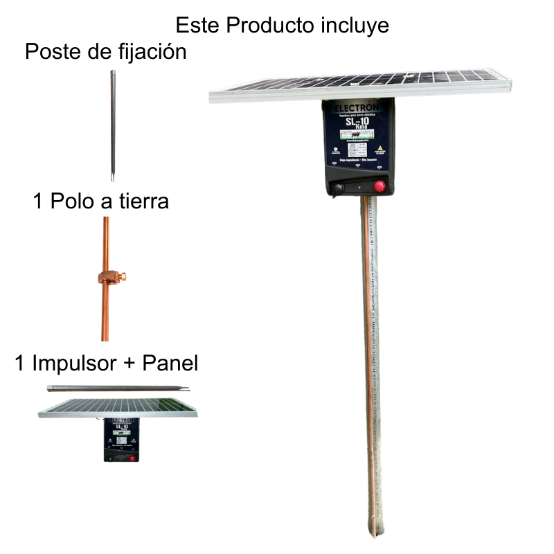 Equipo todo en uno que incluye: batería de 9Ah 12V libre de mantenimiento, impulsor de 10 km marca Electrón, tarjeta reguladora, panel solar de 20W, varilla Copperweld y poste de fijación, todo integrado en un sistema compacto y práctico.